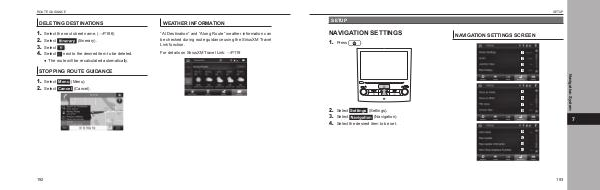 SETUP SETUP NAVIGATION SETTINGS 1. NAVIGATION SETTINGS SCREEN . 2. 3. 4. Press Select Settings (Settings). Select (Navigation). 7 Select the desired item to be set. 193