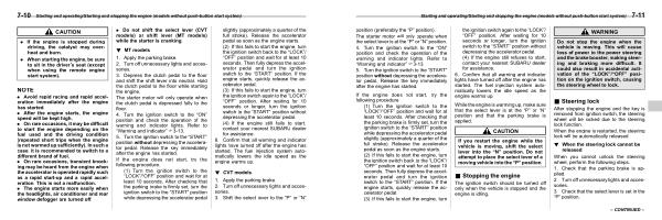 If the engine does not start , try the following procedure . ( 1 ) Turn the ignition switch to the “ LOCK ”/“ OFF ” position and wait for at least 10 seconds . After checking that the parking brake is firmly set , turn the ignition switch to the “ START ” position while depressing the accelerator pedal slightly ( approximately a quarter of the full stroke ). Release the accelerator pedal as soon as the engine starts . ( 2 ) If this fails to start the engine , turn the ignition switch back to the “ LOCK ”/ “ OFF ” position and wait for at least 10 seconds . Then fully depress the accelerator pedal and turn the ignition switch to the “ START ” position . If the engine starts , quickly release the accelerator pedal . ( 3 ) If this fails to start the engine , turn the ignition switch again to the “ LOCK ”/ “ OFF ” position . After waiting for 10 seconds or longer , turn the ignition switch to the “ START ” position without depressing the accelerator pedal . ( 4 ) If the engine still refuses to start , contact your nearest SUBARU dealer for assistance .