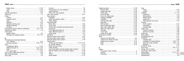 Recommended Brake fluid ............................................................. 12-6 Clutch fluid ............................................................ 12-6 Continuously variable transmission fluid .................... 12-6 Engine oil .............................................................. 12-4 Front differential gear oil ......................................... 12-6 Rear differential gear oil .......................................... 12-6 Spark plugs ........................................................... 12-7 Refueling .................................................................... 7-5 Remote control mirror switch ....................................... 3-87 Remote engine start system ........................................ 7-16 Remote keyless entry system ...................................... 2-19 Replacement Access key fob battery .................................. 2-16 , 11-47 Air cleaner element .............................................. 11-13 Brake pad and lining ............................................. 11-19 Cabin air filter ........................................................ 4-12 Lost transmitters ( remote keyless entry system )......... 2-22 Remote keyless entry transmitter battery ................. 11-48 Tire ..................................................................... 11-27 Wheel ................................................................. 11-28 Wiper blades ....................................................... 11-31