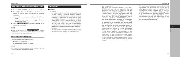 � Warranty Disclaimer Any use of this product ( the “ Product ”), the SUBARU STARLINK software , and any applications that are supported with the Product ( collectively with the Product and the SUBARU STARLINK software , the “ Product System ”), including any reliance upon any of the content displayed by the Product System , shall be at your sole risk . SUBARU CORPORATION and its subsidiaries (“ SUBARU CORPORATION ”) disclaims any and all responsibility or liability for the accuracy , content , completeness , legality , reliability , or operability or availability of any information from the use of the Product System . The telecommunication network used and the particular version of the iPhone , Android or other smart phone ( each , a “ Smart Phone ”) and the related Apple iOS , Android OS or other smart phone OS ( collectively , the Smart Phone and the OS , the “ Phone System ”) used are the responsibility of the customer , and SUBARU CORPORATION shall have no responsibility for the interoperability of the Product System with any telecommunications network / Phone System combination not explicitly supported by SUBARU CORPORATION in written documentation of the Product System .