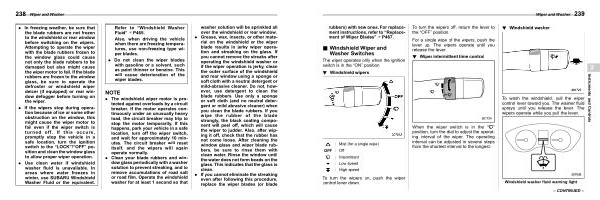 . If the wipers stop during operation because of ice or some other obstruction on the window , this might cause the wiper motor to fail even if the wiper switch is turned off . If this occurs , promptly stop the vehicle in a safe location , turn the ignition switch to the “ LOCK ”/“ OFF ” position and clean the window glass to allow proper wiper operation .