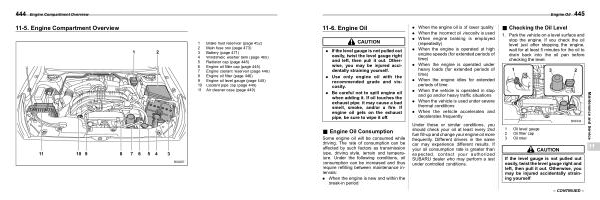 1 Brake fluid reservoir ( page 452 ) 2 Main fuse box ( page 473 ) 3 Battery ( page 471 ) 4 Windshield washer tank ( page 465 ) 5 Radiator cap ( page 448 ) 6 Engine oil filler cap ( page 445 ) 7 Engine coolant reservoir ( page 448 ) 8 Engine oil filter ( page 446 ) 9 Engine oil level gauge ( page 445 ) 10 Coolant pipe cap ( page 449 ) 11 Air cleaner case ( page 449 )