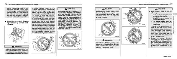 & General Precautions Regarding SRS Airbag System and Children s01ah14 in a child restraint system or in a seatbelt , whichever is appropriate for the child ’ s age , height and weight . The SRS airbag deploys with considerable speed and force and can injure or even kill children , especially if they are not restrained or improperly restrained . Because children are lighter and weaker than adults , their risk of being injured from deployment is greater . According to accident statistics , children are safer when properly restrained in the rear seating positions than in the front seating positions . For instructions and precautions concerning child restraint systems , refer to “ Child Restraint Systems ” FP54 .