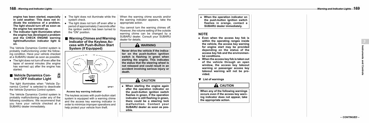 . When the operation indicator on the push-button ignition switch flashes in orange, contact a SUBARU dealer immediately.