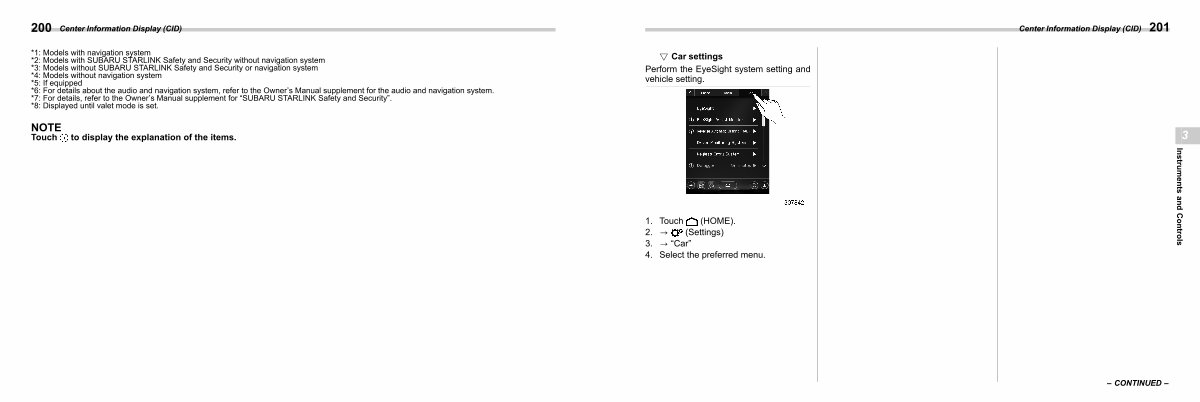 * 1: Models with navigation system * 2: Models with SUBARU STARLINK Safety and Security without navigation system * 3: Models without SUBARU STARLINK Safety and Security or navigation system * 4: Models without navigation system * 5: If equipped * 6: For details about the audio and navigation system, refer to the Owner’ s Manual supplement for the audio and navigation system. * 7: For details, refer to the Owner’ s Manual supplement for“ SUBARU STARLINK Safety and Security”. * 8: Displayed until valet mode is set.