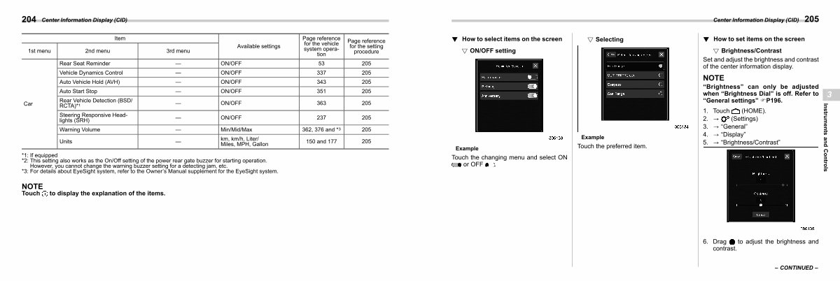 Set and adjust the brightness and contrast of the center information display.