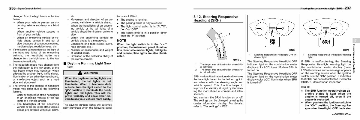 If SRH is malfunctioning, the Steering Responsive Headlight warning light on the combination meter display( color LCD) illuminates and a message appears on the warning screen when the ignition switch is in the“ ON” position. It indicates that SRH has been deactivated. Contact a SUBARU dealer for an inspection.