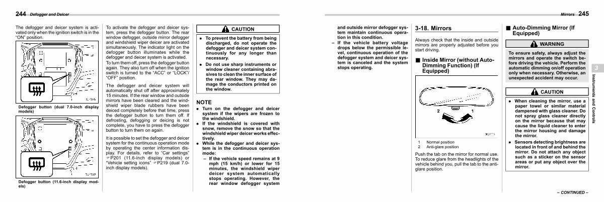 It is possible to set the defogger and deicer system for the continuous operation mode by operating the center information display. For details, refer to“ Car settings” FP201( 11.6-inch display models) or“ Vehicle setting icons” FP219( dual 7.0- inch display models).