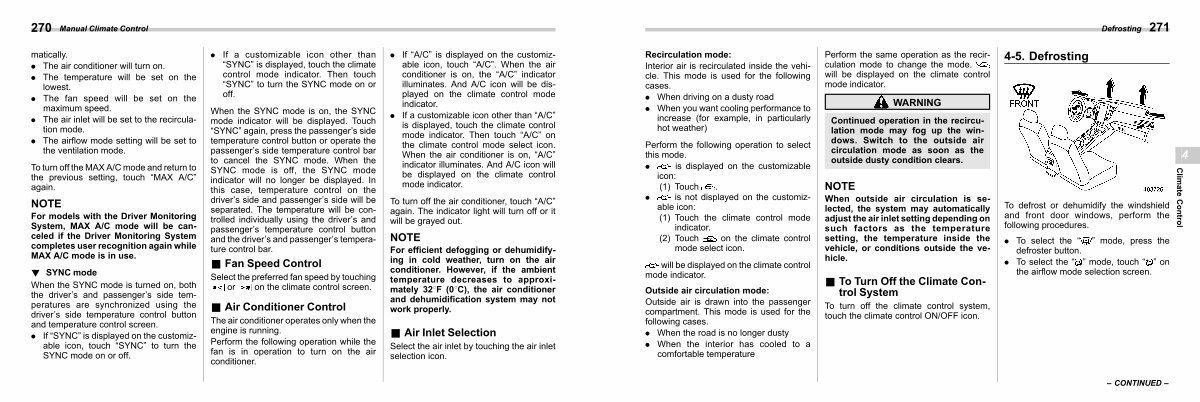Continued operation in the recirculation mode may fog up the windows. Switch to the outside air circulation mode as soon as the outside dusty condition clears.