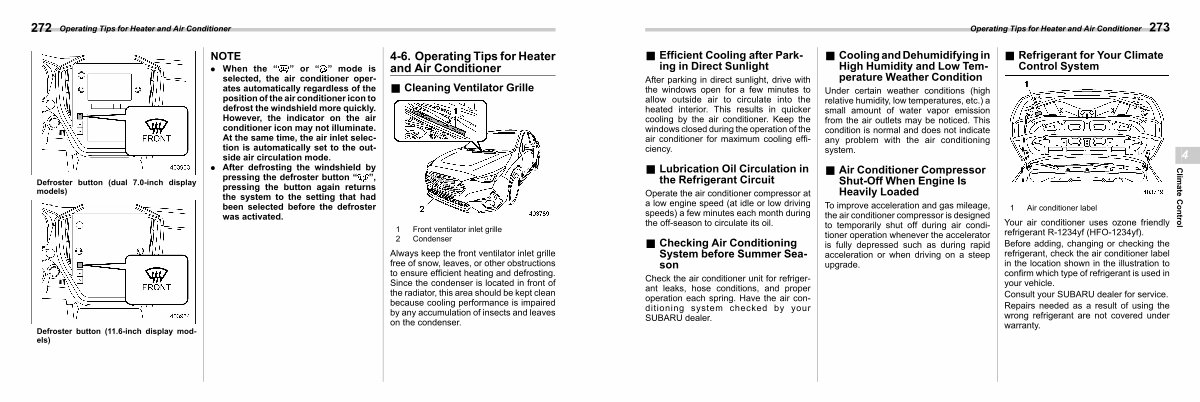 Check the air conditioner unit for refrigerant leaks, hose conditions, and proper operation each spring. Have the air conditioning system checked by your SUBARU dealer.