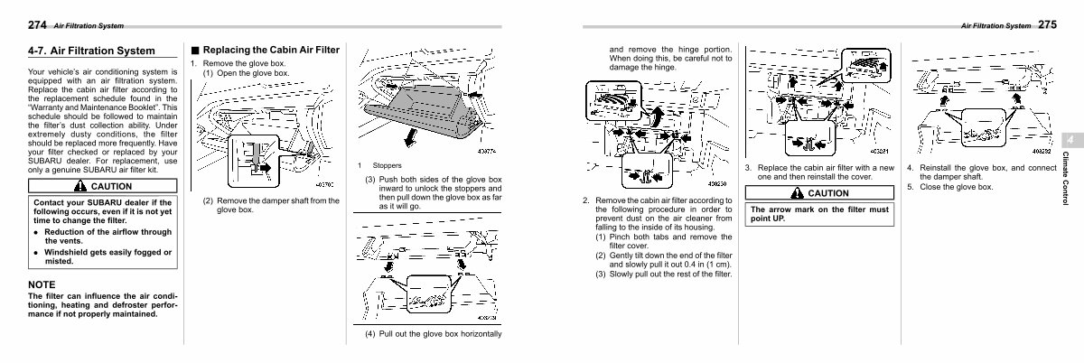 Your vehicle’ s air conditioning system is equipped with an air filtration system. Replace the cabin air filter according to the replacement schedule found in the“ Warranty and Maintenance Booklet”. This schedule should be followed to maintain the filter’ s dust collection ability. Under extremely dusty conditions, the filter should be replaced more frequently. Have your filter checked or replaced by your SUBARU dealer. For replacement, use only a genuine SUBARU air filter kit.