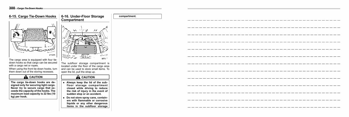 The cargo tie-down hooks are designed only for securing light cargo. Never try to secure cargo that exceeds the capacity of the hooks. The maximum load capacity is 22 lbs( 10 kg) per hook.