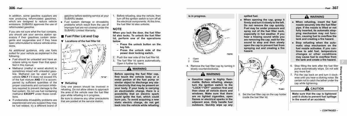 . When opening the cap, grasp it firmly and turn it slowly to the left. Do not remove the cap quickly. Fuel may be under pressure and spray out of the fuel filler neck, especially in hot weather. If you hear a hissing sound while you are removing the cap, wait for the sound to stop and then slowly open the cap to prevent fuel from spraying out and creating a fire hazard.