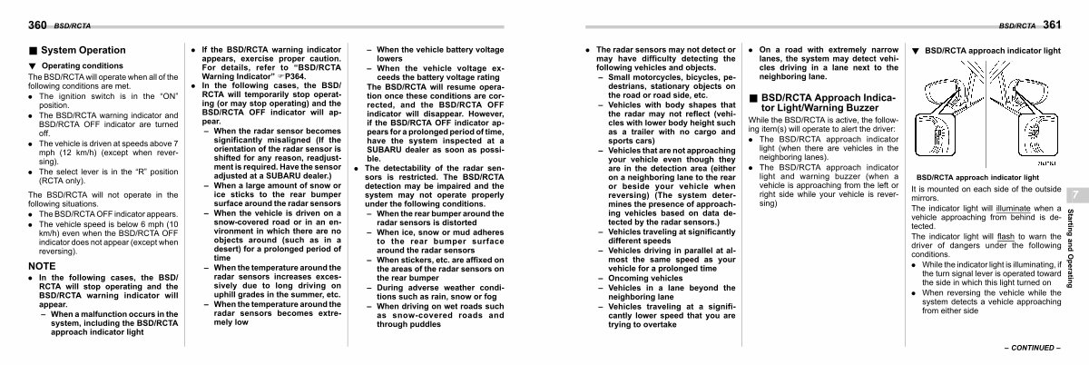 – When the vehicle voltage exceeds the battery voltage rating The BSD / RCTA will resume operation once these conditions are corrected, and the BSD / RCTA OFF indicator will disappear. However, if the BSD / RCTA OFF indicator appears for a prolonged period of time, have the system inspected at a SUBARU dealer as soon as possible.