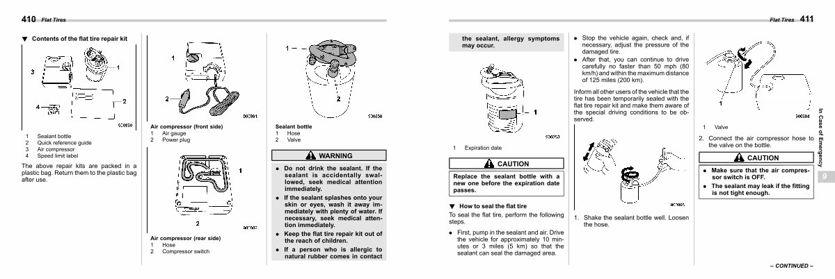 Inform all other users of the vehicle that the tire has been temporarily sealed with the flat tire repair kit and make them aware of the special driving conditions to be observed. |