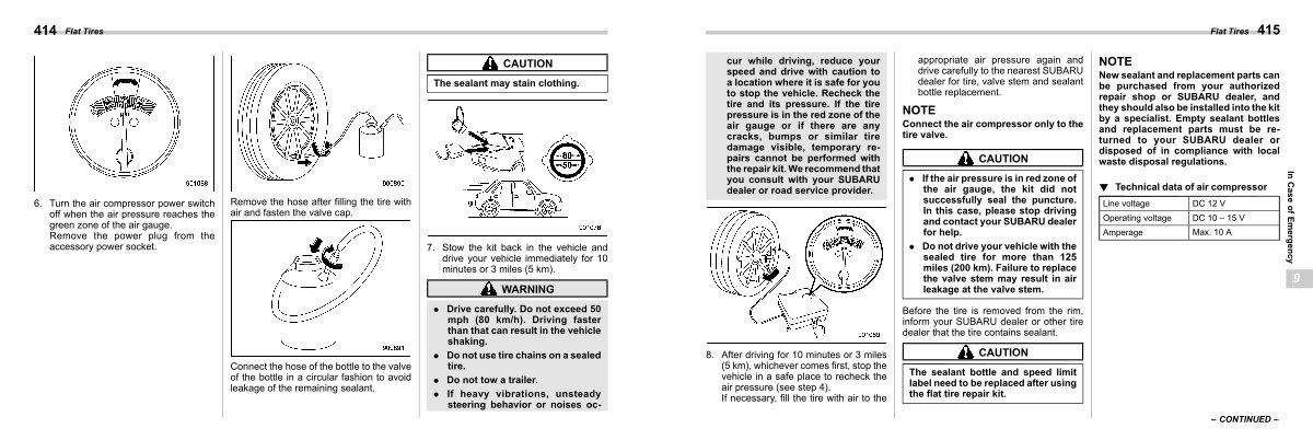 appropriate air pressure again and drive carefully to the nearest SUBARU dealer for tire, valve stem and sealant bottle replacement.
