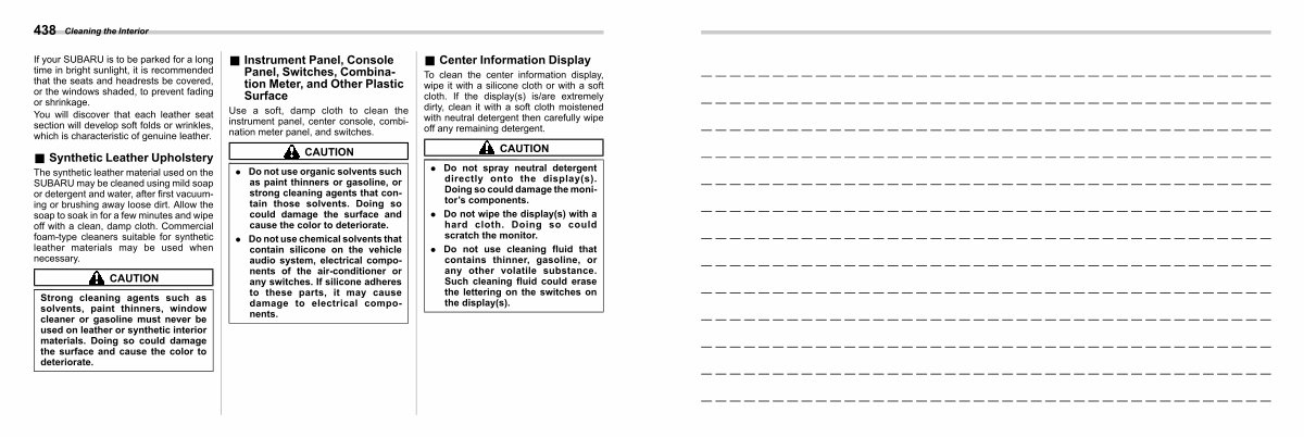 The synthetic leather material used on the SUBARU may be cleaned using mild soap or detergent and water, after first vacuuming or brushing away loose dirt. Allow the soap to soak in for a few minutes and wipe off with a clean, damp cloth. Commercial foam-type cleaners suitable for synthetic leather materials may be used when necessary.