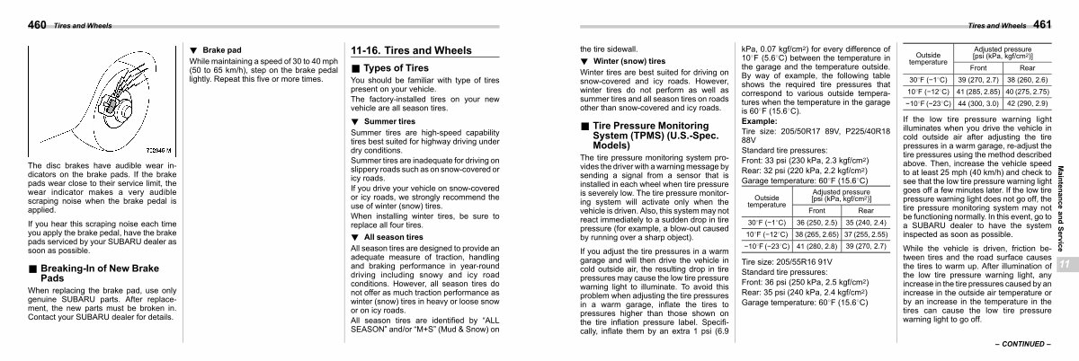 kPa, 0.07 kgf / cm 2) for every difference of 108F( 5.68C) between the temperature in the garage and the temperature outside. By way of example, the following table shows the required tire pressures that correspond to various outside temperatures when the temperature in the garage is 608F( 15.68C).