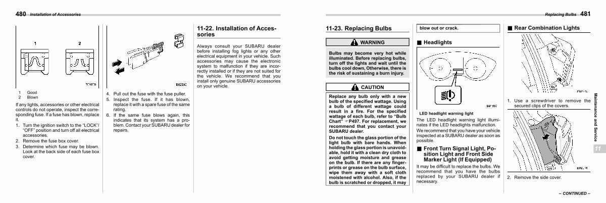 Replace any bulb only with a new bulb of the specified wattage. Using a bulb of different wattage could result in a fire. For the specified wattage of each bulb, refer to“ Bulb Chart” FP497. For replacement, we recommend that you contact your SUBARU dealer.