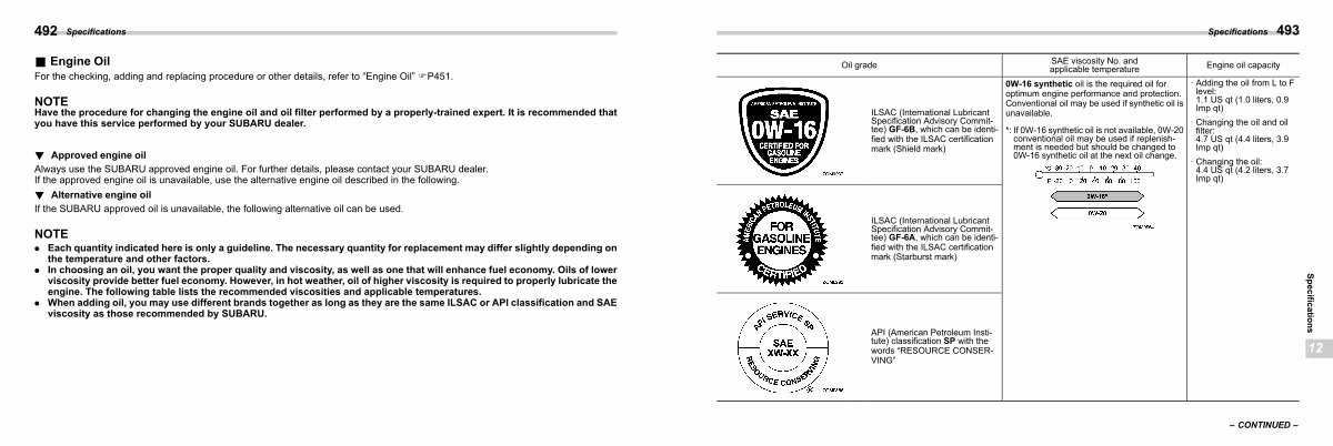 . When adding oil, you may use different brands together as long as they are the same ILSAC or API classification and SAE viscosity as those recommended by SUBARU.