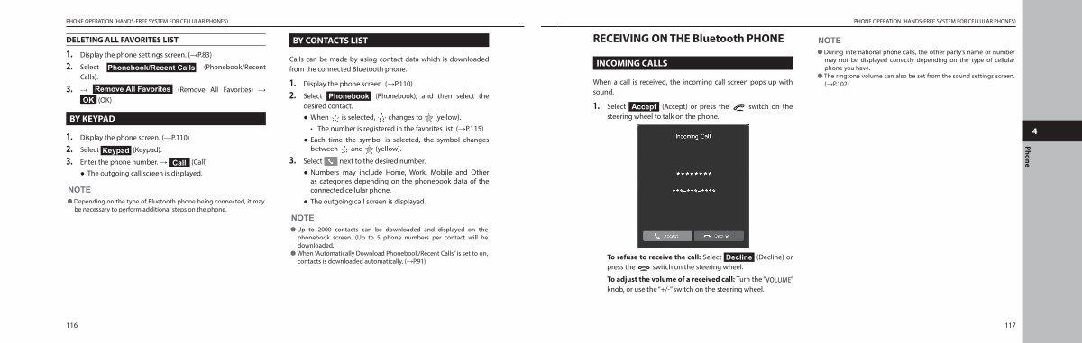 To refuse to receive the call: Select Decline( Decline) or press the switch on the steering wheel. To adjust the volume of a received call: Turn the“” knob, or use the“+/-” switch on the steering wheel.
