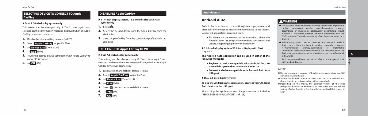 Android Auto can be used to view Google Maps, play music, and place calls by connecting an Android Auto device to the system. Supported applications can also be run.