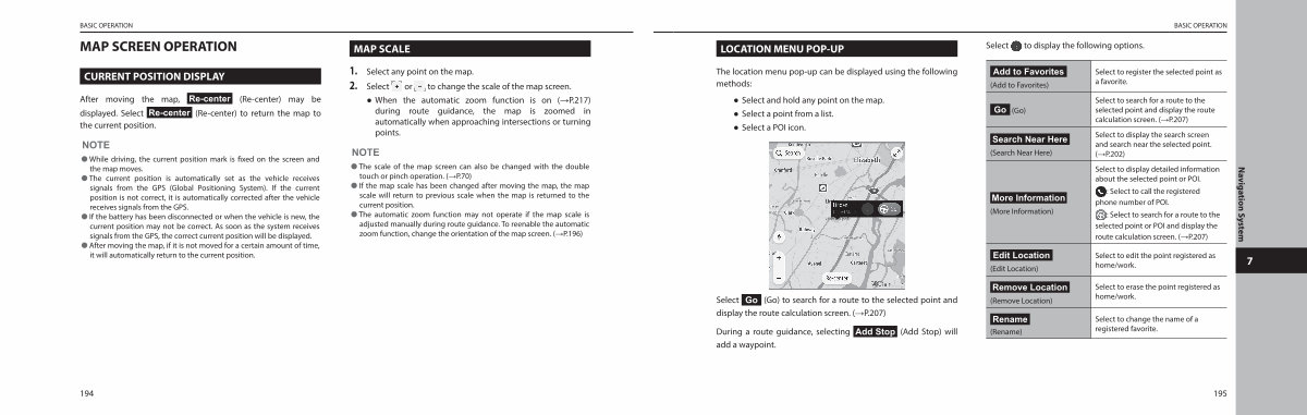� If the battery has been disconnected or when the vehicle is new, the current position may not be correct. As soon as the system receives signals from the GPS, the correct current position will be displayed. � After moving the map, if it is not moved for a certain amount of time, it will automatically return to the current position.