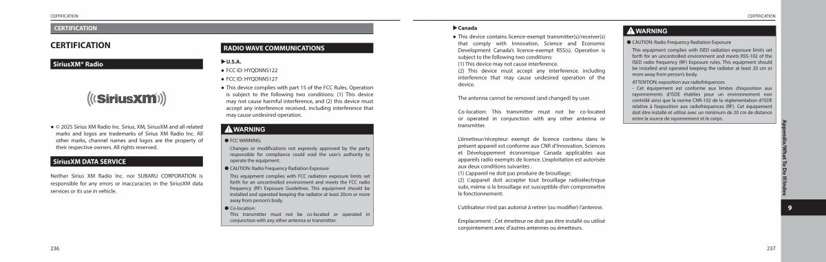 Neither Sirius XM Radio Inc. nor SUBARU CORPORATION is responsible for any errors or inaccuracies in the SiriusXM data services or its use in vehicle.