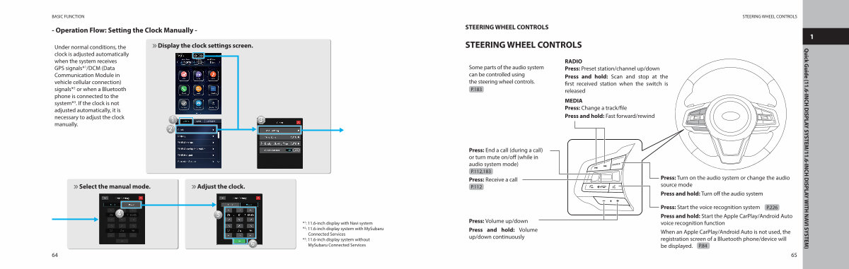 Under normal conditions, the clock is adjusted automatically when the system receives GPS signals * 1 / DCM( Data Communication Module in vehicle cellular connection) signals * 2 or when a Bluetooth phone is connected to the system * 3. If the clock is not adjusted automatically, it is necessary to adjust the clock manually.