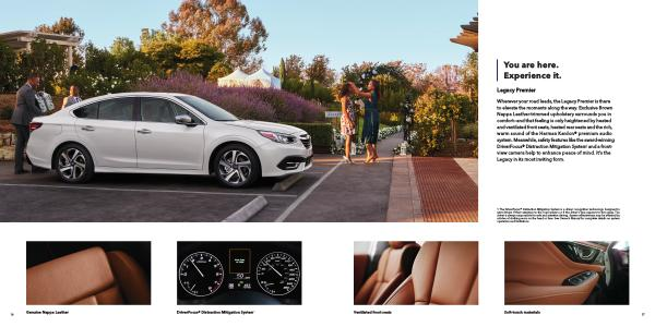 Wherever your road leads , the Legacy Premier is there to elevate the moments along the way . Exclusive Brown Nappa Leather-trimmed upholstery surrounds you in comfort — and that feeling is only heightened by heated and ventilated front seats , heated rear seats and the rich , warm sound of the Harman Kardon ® premium audio system . Meanwhile , safety features like the award-winning DriverFocus ® Distraction Mitigation System 1 and a frontview camera help to enhance peace of mind . It ’ s the Legacy in its most inviting form .