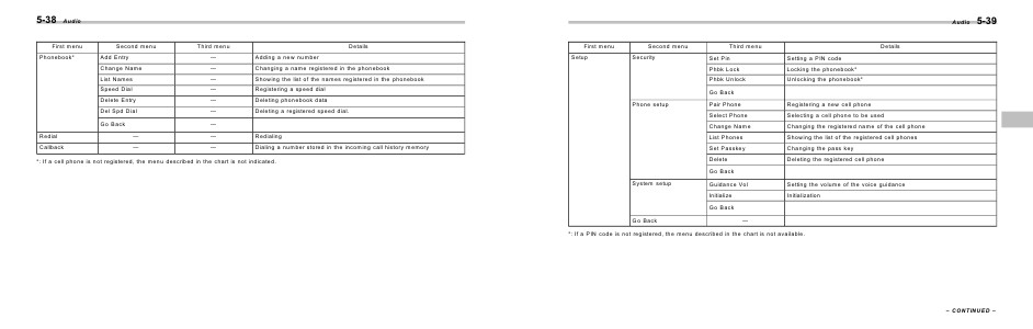 *: If a PIN code is not registered, the menu described in the chart is not available.
