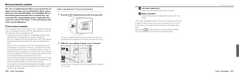 The voice recognition function allows you to operate the navigation system, audio system and hands-free phone system