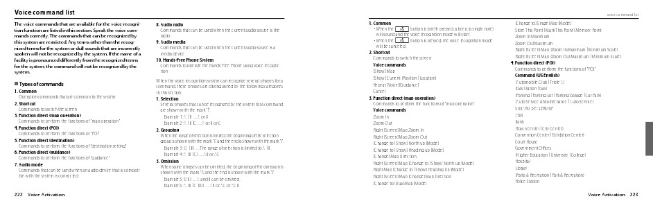 The voice commands that are available for the voice recognition function are listed in this section. Speak the voice commands correctly. The commands that can be recognized by