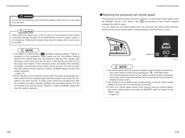 • When operation of Conventional Cruise Control has been automatically canceled , perform the set operation again after the condition that caused the cancellation has been resolved . If cruise control cannot be activated even after the condition has been corrected , EyeSight may be malfunctioning . This will not interfere with ordinary driving . However , contact a SUBARU dealer and have the system inspected .