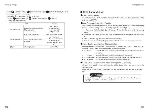 Touch ( Vehicle Control ), ( Driving Assistance ) or ( Others ) to display the items that are changeable while driving . Change the EyeSight system setting as follows : 1 . Touch ( Vehicle Control ), ( Driving Assistance ) or ( Others ). 2 . Select the preferred menu .