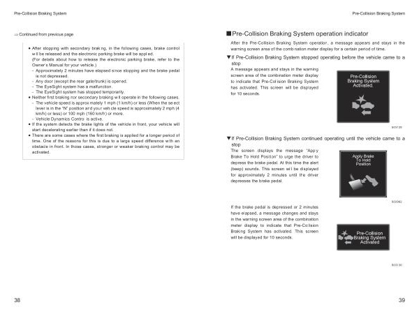 • After stopping with secondary braking , in the following cases , brake control will be released and the electronic parking brake will be applied . ( For details about how to release the electronic parking brake , refer to the Owner ’ s Manual for your vehicle .) - Approximately 2 minutes have elapsed since stopping and the brake pedal is not depressed . - Any door ( except the rear gate / trunk ) is opened . - The EyeSight system has a malfunction . - The EyeSight system has stopped temporarily .