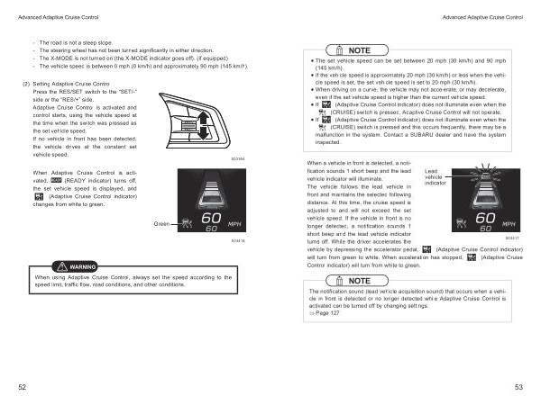 When a vehicle in front is detected , a notification sounds 1 short beep and the lead vehicle indicator will illuminate . The vehicle follows the lead vehicle in front and maintains the selected following distance . At this time , the cruise speed is adjusted to and will not exceed the set vehicle speed . If the vehicle in front is no longer detected , a notification sounds 1 short beep and the lead vehicle indicator turns off . While the driver accelerates the vehicle by depressing the accelerator pedal , ( Adaptive Cruise Control indicator ) will turn from green to white . When acceleration has stopped , ( Adaptive Cruise Control indicator ) will turn from white to green .