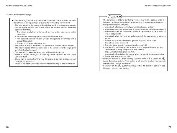 • The performance of Lane Centering Function may not be optimal under the following conditions . In addition , Lane Centering Function may not operate or the operation may be canceled . - Immediately after the weight of your vehicle changes radically - Immediately after the replacement of a tire or the adjustment of tire pressure - Immediately after the adjustment , repair or replacement of the camera or related components - Immediately after the repair or replacement of the suspension or steering system - A winter tire or a tire other than a genuine SUBARU tire is used . - The vehicle is in a crosswind . - The road grade abruptly changes ( uphill or downhill ). - The grade of the crossing direction in a road is large or changes abruptly . - Unevenness , winding and joint of a road surface - The acceleration / deceleration is high . - Immediately after starting the engine when the outside temperature is low . - The outside temperature is high .