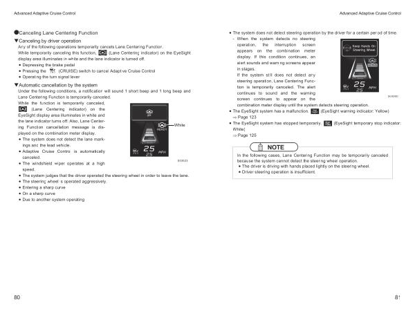 �Canceling by driver operation Any of the following operations temporarily cancels Lane Centering Function . While temporarily canceling this function , ( Lane Centering indicator ) on the EyeSight display area illuminates in white and the lane indicator is turned off .