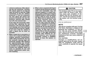 . When a tire is repaired with liquid sealant , the tire pressure warning valve and transmitter may not operate properly . If a liquid sealant is used , contact your nearest SUBARU dealer or other qualified service shop as soon as possible . Make sure to replace the tire pressure warning valve and transmitter when replacing the tire . You may reuse the wheel if there is no damage to it and if the sealant residue is properly cleaned off . Do not inject any tire liquid or aerosol tire sealant into the tires , as this may cause a malfunction of the tire pressure sensors . If the light illuminates steadily after blinking for approximately one minute , promptly contact a SUBARU dealer to have the system inspected . |