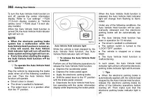 . When the electronic parking brake system has a malfunction while the Auto Vehicle Hold function is turned on , a chirp will sound , the Auto Vehicle Hold indicator light will turn off and the brake system warning light will turn on . . Every time when starting the engine , the Auto Vehicle Hold function will be set to off .