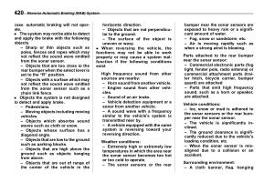 case , automatic braking will not operate . . The system may not be able to detect and apply the brake with the following objects . – Sharp or thin objects such as poles , fences and ropes which may not reflect the sound wave emitted from the sonar sensor . – Objects that are too close to the rear bumper when the select lever is set to the “ R ” position . – Objects with a surface which may not reflect the sound wave emitted from the sonar sensor such as a chain link fence . . Objects the system is not designed to detect and apply brake . – Pedestrians . – Moving objects including moving vehicles . – Objects which absorbs sound waves such as cloth or snow . – Objects whose surface has a diagonal angle . – Objects that are low to the ground such as parking blocks . – Objects that are high above the ground such as objects hanging from above . – Objects that are out of range of the center of the vehicle in the horizontal direction . – Objects that are not perpendicular to the ground . – The surface of the object is uneven or wavy . . When reversing the vehicle , the functions may not be able to work properly or may cause a system malfunction if the following conditions exist .