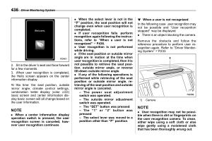 . When the select lever is not in the “ P ” position , the seat position will not change even when user recognition is completed . . If user recognition fails , perform recognition again following the instructions , refer to “ When a user is not recognized ” FP436 . . User recognition is not performed while driving . . If the seat position or outside mirror angle are in motion at the time when user recognition is completed , then it is not possible to retrieve the seat position , outside mirror angle , or reverse tilt-down outside mirror angle . . If any of the following operations is performed while retrieving of the seat position or outside mirror angle , retrieving of the seat position and outside mirror angle is canceled . – The power seat adjustment switch was operated . – The outside mirror adjustment switch was operated . – The “ SET ” button was pressed . – The “ 1 ” or “ 2 ” button was pressed . – The select lever was moved to a position other than “ P ” position .