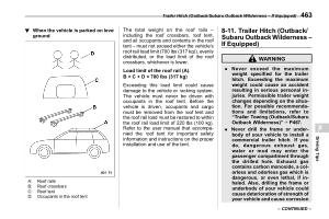 . Never exceed the maximum weight specified for the trailer hitch . Exceeding the maximum weight could cause an accident resulting in serious personal injuries . Permissible trailer weight changes depending on the situation . For possible recommendations and limitations , refer to “ Trailer Towing ( Outback / Subaru Outback Wilderness )” FP467 .
