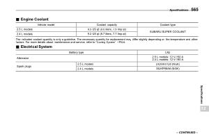 SUBARU SUPER COOLANT 2.4 L models 9.2 US qt ( 8.7 liters , 7.7 Imp qt ) The indicated coolant quantity is only a guideline . The necessary quantity for replacement may differ slightly depending on the temperature and other factors . For more details about maintenance and service , refer to “ Cooling System ” FP524 .