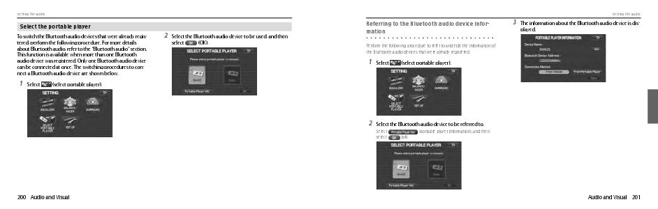 Setting the audio Select the portable player To switch the Bluetooth audio devices that were already registered, perform the following procedure. For more details about Bluetooth audio, refer to the "Bluetooth audio" section. This function is available when more than one Bluetooth audio device was registered. Only one Bluetooth audio device can be connected at once. The switching procedures to connect a Bluetooth audio device are shown below. 1 Select (select portable player). 200 Audio and Visual 2 Select the Bluetooth audio device to be used, and then select (OK).