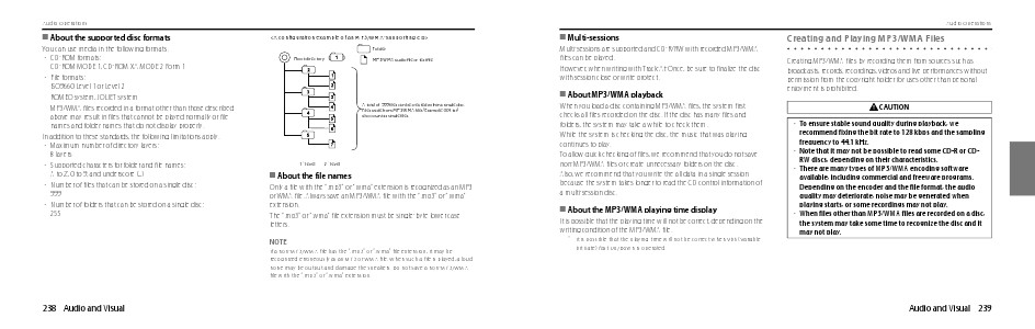 Folder Root directory MP3/WMA audio file or text file A total of 999 files can be created within a single disc. Files aside from MP3/WMA files (Example: 004.txt) also count as single files. 1st level 2nd level I About the file names Only a file with the “.mp3” or “.wma” extension is recognized as an MP3 or WMA file. Always save an MP3/WMA file with the “.mp3” or “.wma” extension. The “.mp3” or “.wma” file extension must be single-byte lower case letters. NOTE If a non-MP3/WMA file has the “.mp3” or “.wma” file extension, it may be recognized erroneously as an MP3 or WMA file. When such a file is played, a loud noise may be output and damage the speakers. Do not save a non-MP3/WMA file with the “.mp3” or “.wma” extension. 238 Audio and Visual