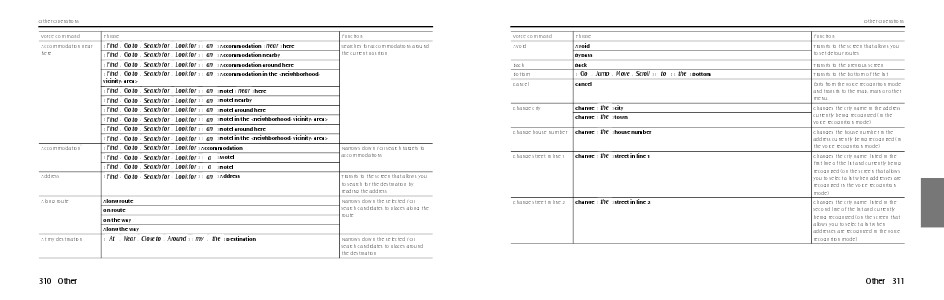 Other Operations Voice command Phrase Function Accommodation near here [ Find , Go to , Search for , Look for ] [ an ] Accommodation [ near ] here Searches for accommodations around the current position [ Find , Go to , Search for , Look for ] [ an ] Accommodation nearby [ Find , Go to , Search for , Look for ] [ an ] Accommodation around here [ Find , Go to , Search for , Look for ] [ an ] Accommodation in the [ Find , Go to , Search for , Look for ] [ an ] Hotel [ near ] here [ Find , Go to , Search for , Look for ] [ an ] Hotel nearby [ Find , Go to , Search for , Look for ] [ an ] Hotel around here [ Find , Go to , Search for , Look for ] [ an ] Hotel in the [ Find , Go to , Search for , Look for ] [ an ] Hotel around here [ Find , Go to , Search for , Look for ] [ an ] Hotel in the Accommodation* [ Find , Go to , Search for , Look for ] Accommodation [ Find , Go to , Search for , Look for ] [ a ] Motel Narrows down POI search targets to accommodations [ Find , Go to , Search for , Look for ] [ a ] Hotel Address [ Find , Go to , Search for , Look for ] [ an ] Address Transits to the screen that allows you to search for the destination by reading the address Along route Along route Narrows down the selected POI search candidates to places along the route On route On the way Along the way At my destination 310 Other [ At , Near , Close to , Around ] [ my , the ] Destination Narrows down the selected POI search candidates to places around the destination
