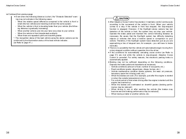 • After Adaptive Cruise Control has started, it maintains control continuously according to the movement of the vehicle in front. When your vehicle comes to a stop if the vehicle in front has stopped, the stay-stopped function is engaged. However, if the EyeSight stereo camera has lost detection of the vehicle in front, the system may not stop your vehicle. Operate the brake pedal and maintain the correct following distance as necessary. Be aware that the EyeSight system has difficulty detecting objects or vehicles that have a relative speed in comparison to your vehicle. Therefore, if the EyeSight system loses detection just as you are approaching a line of stopped cars, for example- you will have to brake manually.