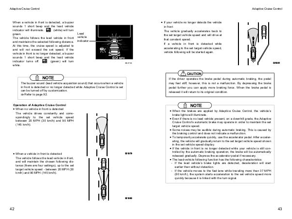 • The lead-vehicle following function has the following characteristics:- If the lead vehicle’ s brake lights are detected, deceleration will start earlier than without detection.